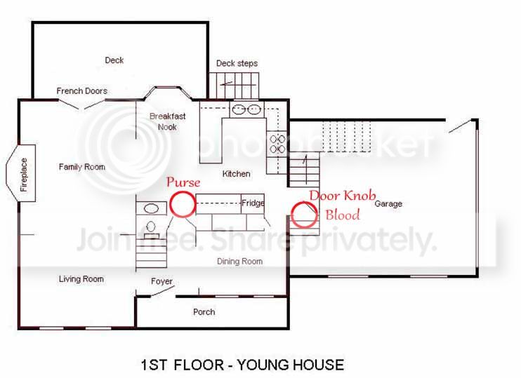 Here's the doorknob with blood in relation to the purse. The photo is taken from the kitchen looking towards the front entrance.