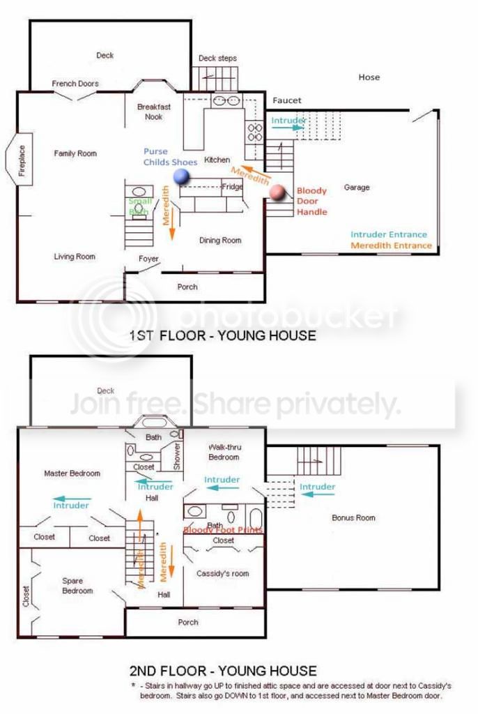 Regarding the floorplans, I have been using the ones that were posted (linked upthread) on the Frictionpowered website. There is a mistake in those plans. That is, the child's bedroom is mis-labelled. The child's bedroom is in fact right next to the bathroom. I have made the correction in the bottom illustration. I also enhanced the red in the top photo to see if red could be seen on the carpet. Additionally, I lightened the room to see whose room it was.