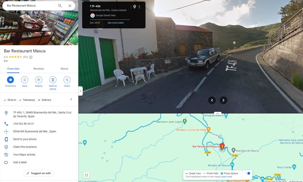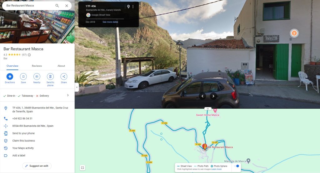 Looking on Google Maps at the location of the AirBnB I noticed that the same building also has a cafe/restaurant with a small shop selling groceries. However, reading the Google reviews of this shop/cafe, it says that they only take cash. I would have thought that the shop would be open at 8am on a Monday morning, but perhaps not. If it was, and JS had no cash, perhaps he would have looked at the map on his phone before the battery died and seen that the closest place for food/water/civilisation was the Mirador, which is uphill. It may not have looked too far away. I also note, from StreetView that there is an off road footpath heading towards a place called Sweet Home Masca, which may have looked like a shortcut to the Mirador. If you follow StreetView along this path it becomes very difficult to navigate/see where the path is and is absolutely full of cacti. It is easy to understand how you could very quickly become lost and disorientated in this place without GPS help.