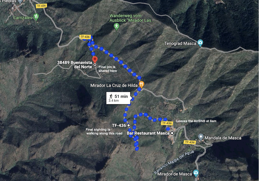 The police hung up on Lucy according to her interview originally- which is a fair point in that he wasn’t missing, just slightly lost. He was a teenager who had been missing for an hour and then rang his friend and had identified the area he was in. Whilst it would have been useful in hindsight to take this more seriously, they didn’t and SAR weren’t actioned until 2.30am the following morning. There is a post of the SAR team on the official Facebook page stating the times they were notified. This also matches up to the time reported his mum was awoken in the UK and informed- so apart from Lucy on that first day, no one was looking. In between all the mixed reporting, she rang got hung up on and then went physically to report it (it’s not clear whether that was before or after she got a lift to Masca and identified where he had been staying). I wonder if in Tenerife they do have an unwritten rule of 24 hours for tourists missing who may just be hanging out elsewhere still enjoying life and Lucy had gone home at around 2.30, so that triggered the 24 hours. That’s all just guessing and trying to make some coherent sense of the multiple conflicting reports I have read in the press. I am struggling to even search and link day one press articles at the moment, so take this all as my opinion- but a confidently accurate one.