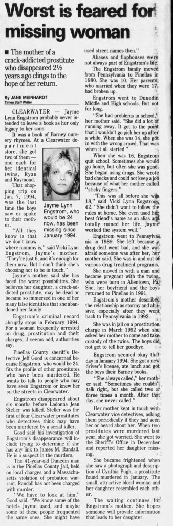 Prior to her disappearance, Engstrom had been arrested multiple times for prostitution, theft and drug charges, but her criminal record abruptly stopped after early 1994. She was a known prostitute in the Clearwater area, and lived near north Fort Harrison Avenue. She had also been arrested for prostitution in Pennsylvania and Massachusetts.