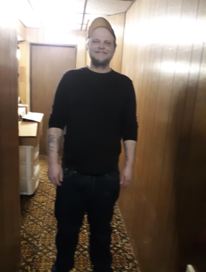 Wearing: black long sleeved shirt, jeans, blue sneakers
