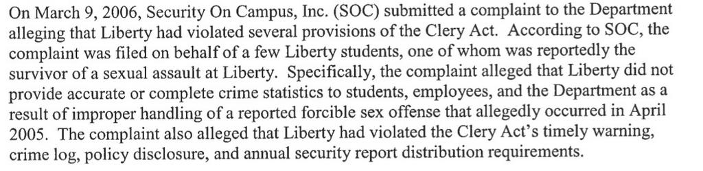 Here is a wonderfully germane excerpt of a letter sent to Jerry Falwell, Liberty University, from the US Dept of Education, fining the university $165,000.