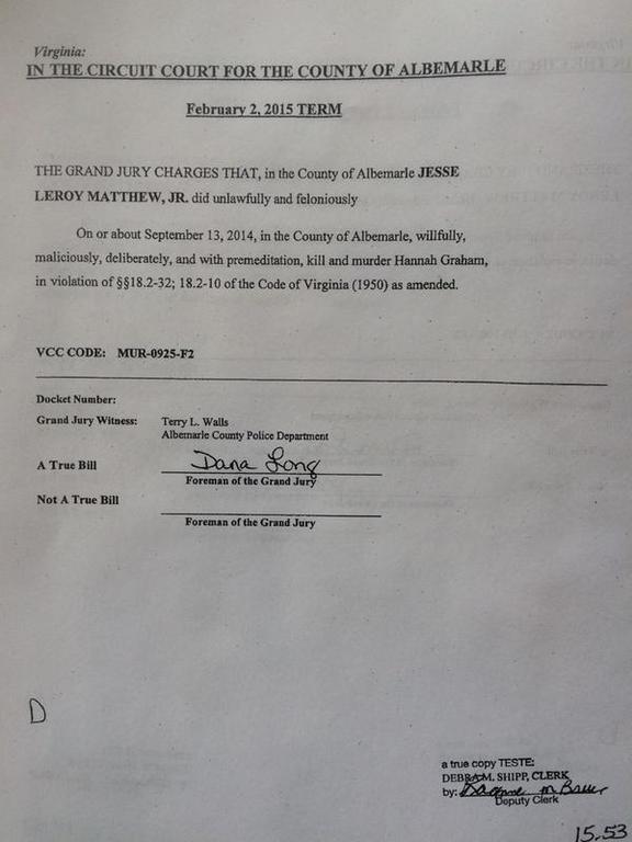 JUST IN: @HenryGraff reports copy of grand jury indictment for #JesseMatthew on #HannahGraham murder.