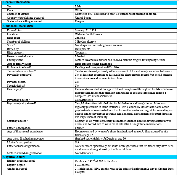 I love this boy. He is such a hard worker. He will chop wood and mow the lawn etc. But as far as real relationship building, he is in a constant struggle. He does love his dad and I. He is very handsome with piercing blue eyes. I will never give up because after all he is my son. I believe most serial killers are affected by attachment disorder. Not all children with attachment disorder are serial killers. I have read in studies that in young boys there is a treshhold of the age of seven if they haven't attached to someone by then they may never attach to anyone correctly. My guy came at 7 but he was and is extremely immature for his age. He was on the cusp. In my opinion I believe they should be trying to intervene with these young men and not try to stockpile data. My childs therapist was and is willing to help in any way. I am sorry about going on so but I feel like I had a little bit to offer on the psyc. aspect or lack there of. In addition I am so sorry to the Harringtons and the Grahams.