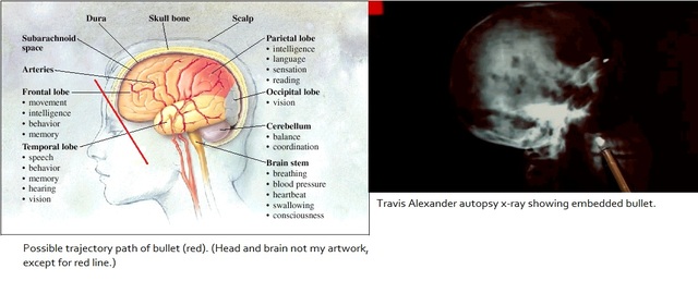 2. At no time after the throat wound would Travis have been in a sitting up position that could have led to the path of the projectile from right brow to left cheek unless Jodi was laying on the floor shooting him...an outlandish scenario.