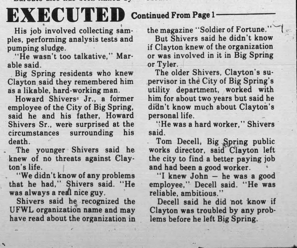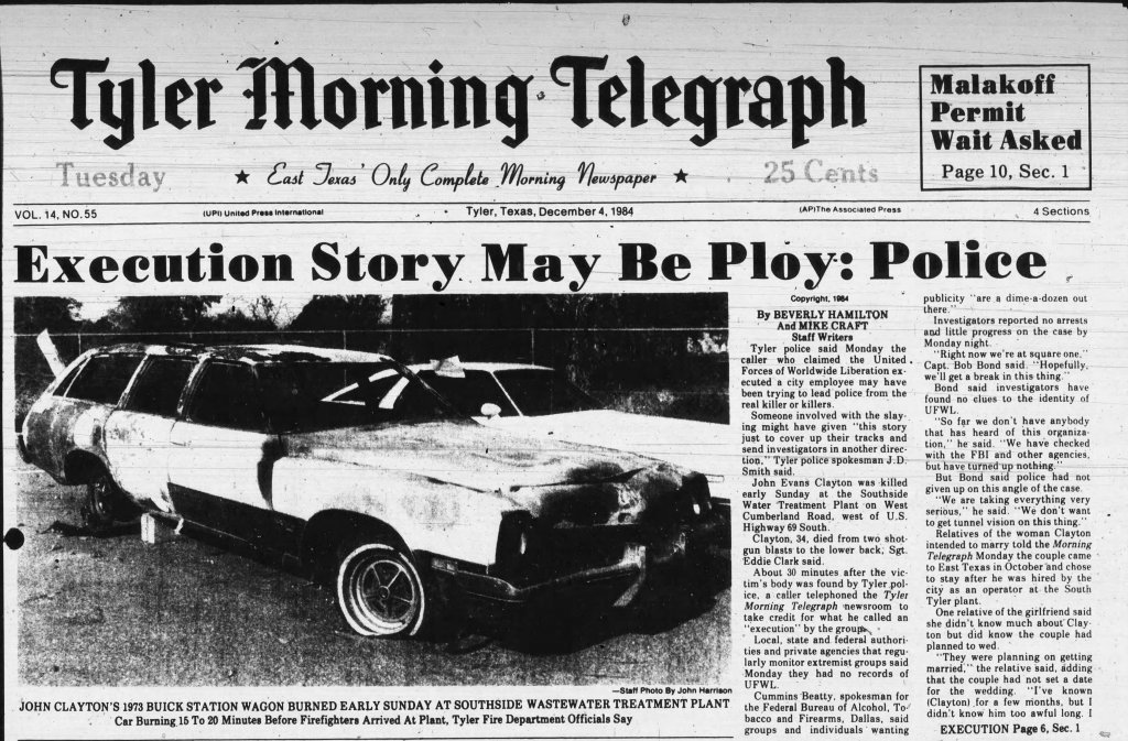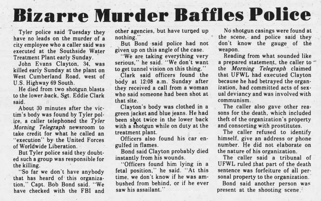 John Evans Clayton, 34 years old, went into work at the Southside Wastewater Treatment Plant in Tyler, TX on Saturday Dec 1, 1984 for his 11pm-7am overnight shift. In the very early morning hours of Sunday, Dec 2, 1984, a 911 call was received from a female stating she heard a gun shot & she saw a car on fire. This female was John’s girlfriend who came to visit him. At the time of the call, she was on the other side the of the plant. When officers arrived they found John Clayton laying in a fetal position deceased from two shot gun blasts in the back. His station wagon was nearby in flames.