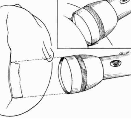A rough rectangular indent is not what I would expect to see, so although I could not rule out the flashlight, its geometry does not seem to match the skull dpression, but what do I know?