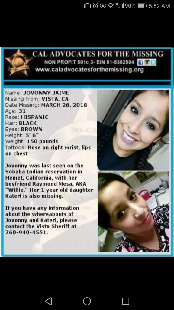BOLO: Missing mother and her 1 year old daughter Kateri. Jovonny "Jovy" Jaime was last seen on the Sobaba Indian reservation in Hemet/San Jacinto, California, with her boyfriend Raymond Mesa, AKA "Willie." Her 1 year old daughter Kateri is also missing.