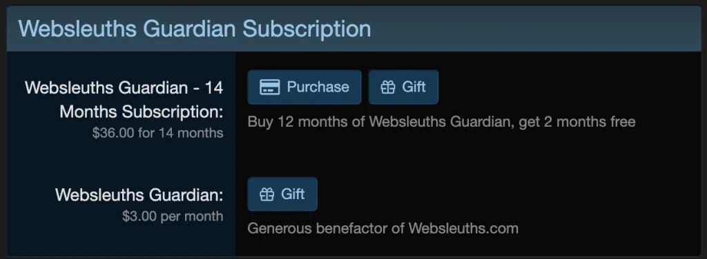 I have been a member for many years, this is a great way to support the site! I do take breaks away but always find my way back to WS's when a case catches my interest! Thanks for all you do @Tricia @fraize and all mods! ❤️