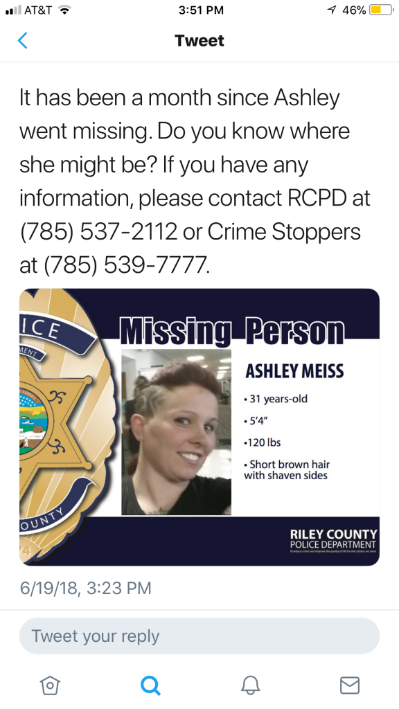 RCPD has received several tips that people last saw her at the Ogden Community Center and Post Office on Friday May 18th but no other sightings.“ (BBM)