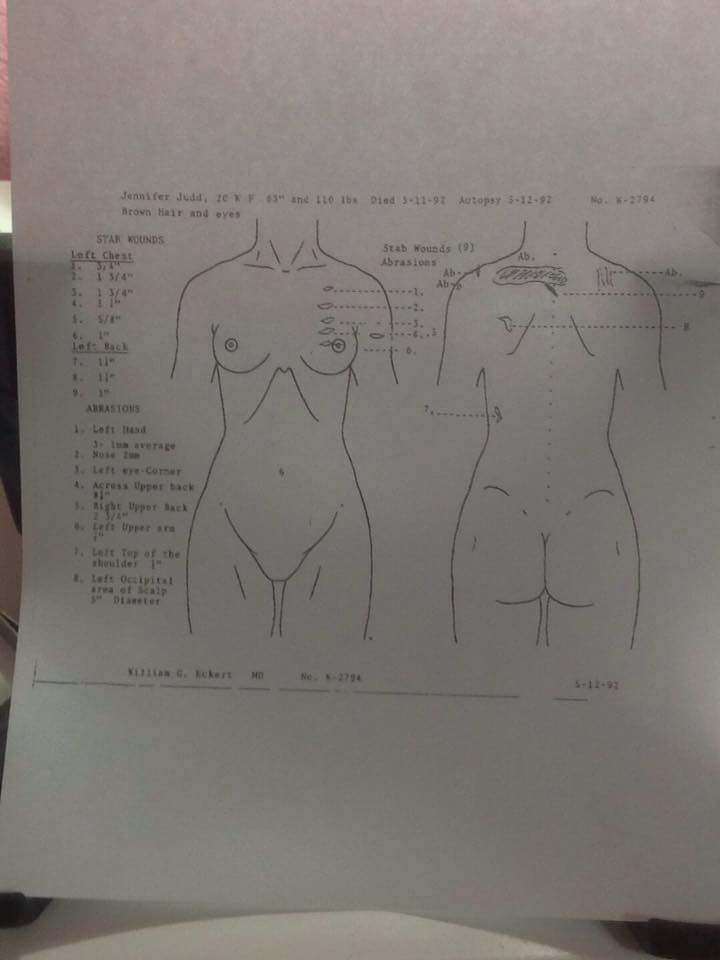 Since Mark Garrett saw fit to post Jennifer's autopsy report on other websites I thought I would go ahead and share it here. It's always been said that the knife broke and the tip of the knife was logged in her sternum. But maybe that's not true since there's no wound there.