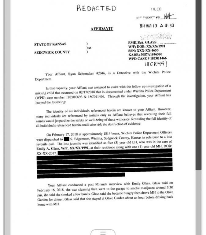 "Feb. 5, 2018: Although the report is mostly about Lucas, it also deals with Glass' two elementary school age sons from a previous relationship who visit her from time to time. In February, DCF received a report alleging that Hernandez, Lucas’ father, “smacked” one of Glass’ two sons during a visit. It left a hand print on the boy’s chest, the father of Glass’ son said. DCF assigned a social worker to investigate. The Sedgwick County Exploited and Missing Child Unit also investigated. According to the court document, filed Feb. 23, the investigation was ongoing.