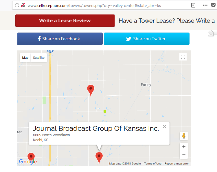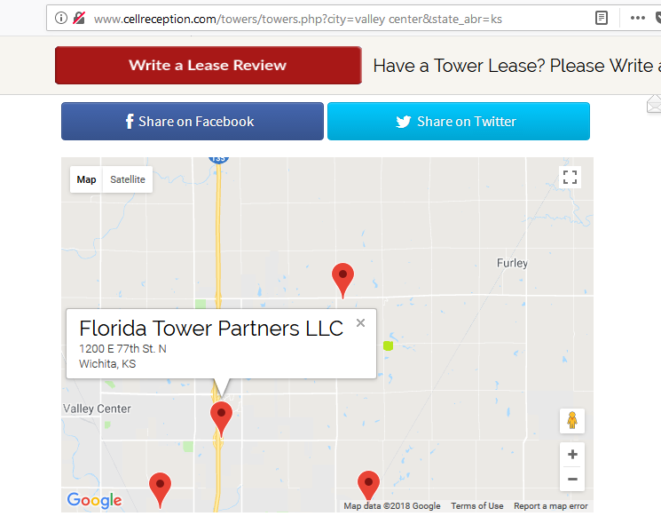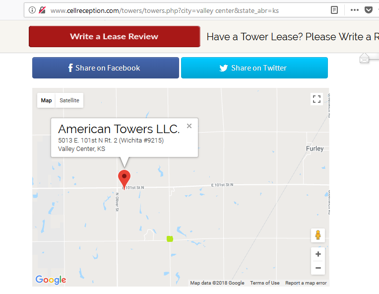 First image shows nearest cell tower; small green square at 96th/Woodlawn on map. The other maps are the other towers in this area along the way up from Wichita toward Valley Center.