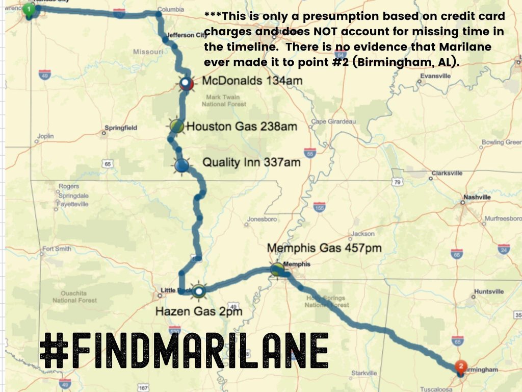 BIG news on cell phone triangulation / data: It appears law enforcement in Arkansas were able to obtain an exigent circumstances search warrant for Marilane's cell phone - to include tower data dumps and content. This data should help law enforcement forensic cell phone experts better determine where Marilane's phone is. Please pray this results in a breakthrough to find her.