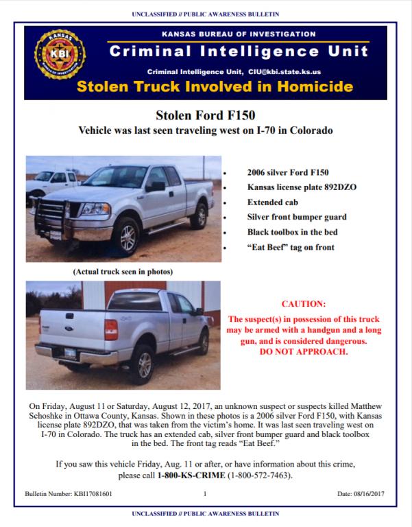 According to new information released by the Kansas Bureau of Investigation Wednesday, the silver 2006 Ford F-150 owned by Matthew Schoshke, 35, was last seen traveling west on Interstate 70 in Colorado.