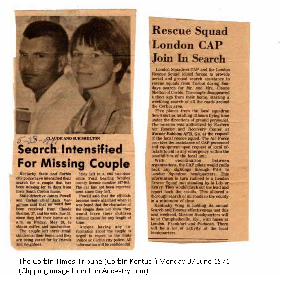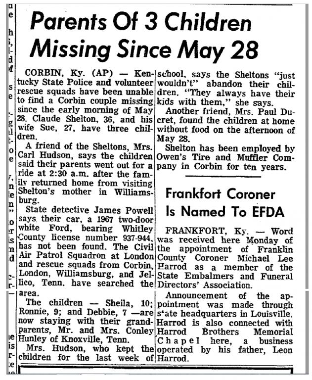On May 21, 1971, Sue, 27, and Claude Shelton, 37, came home from a small get together with their friends. They put their 3 children into bed, letting them know that they were going to drive to a nearby truck stop for a late-night bite to eat. At around 2:00 AM they left their home at Gerry’s Trailer Park on 18th Street in Corbin, Ky, and headed to King’s Truck Stop. This was around 5 miles from their home, so it shouldn’t have taken them long to drive there and back, but they’ve never returned.