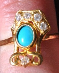 BTW, if you google "turquoise gold rings" you get page after page of rings in unusual settings like this one, many of them with diamonds or other sparkling stones and most of them thoroughly American. The turquoise stone and soft gold seem to be popular with independent jewelry makers. I haven't yet found one identical, but I'm finding some that are in the ballpark.