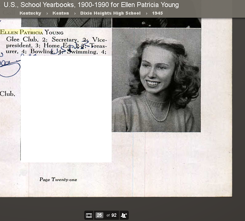 Then I found a yearbook picture that has to be her-- it is from 1945 Dixie Heights High School in Kenton, KY. Kenton is about 7.5 miles from Fort Mitchell.