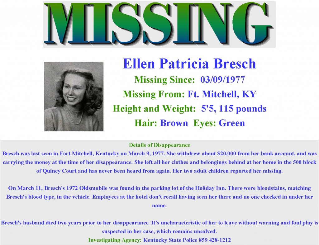Bresch was last seen in Fort Mitchell, Kentucky on March 9, 1977. She withdrew about $20,000 from her bank account, and was carrying the money at the time of her disappearance. She left all her clothes and belongings behind at her home in the 500 block of Quincy Court and has never been heard from again. Her two adult children reported her missing.