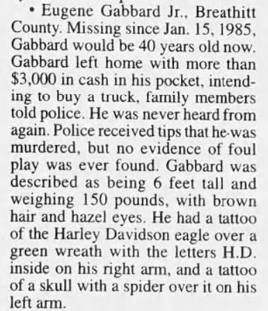 Gabbard was last seen in Jackson, Kentucky on January 14, 1985. He has never been heard from again. At the time of his disappearance, he was driving a blue 1976 Pontiac 2+2, license plates KY JGM-248 which has never been located. Few details are available regarding Gabbard's disappearance and his whereabouts remain unknown