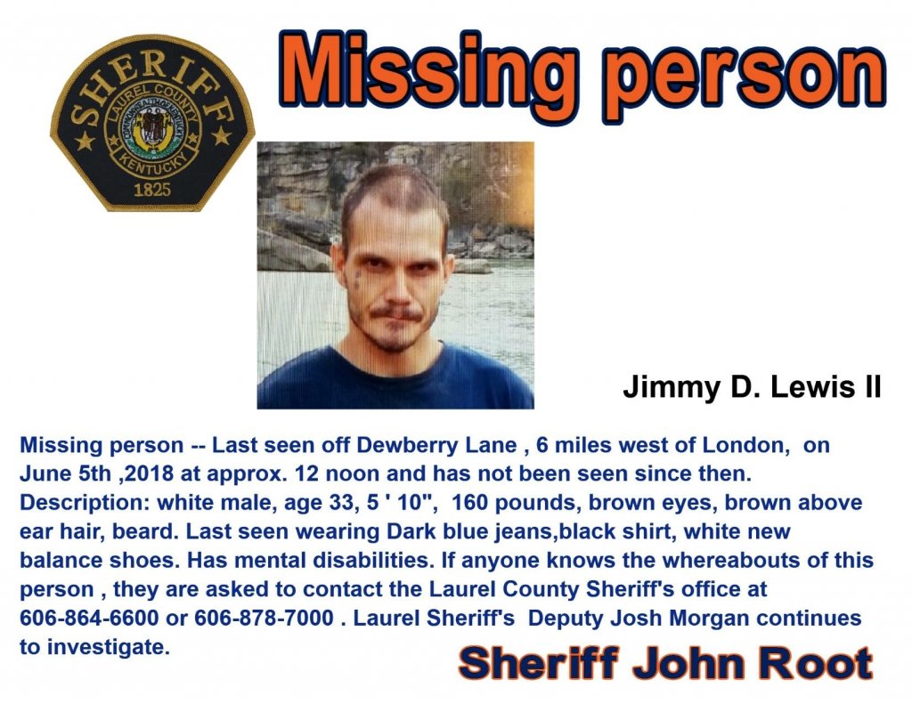 Deputies say Jimmy D. Lewis II, 33, was last seen off Dewberry Lane six miles west of London around 12 p.m. on Tuesday, June 5. He has been missing for several days and has mental disabilities.