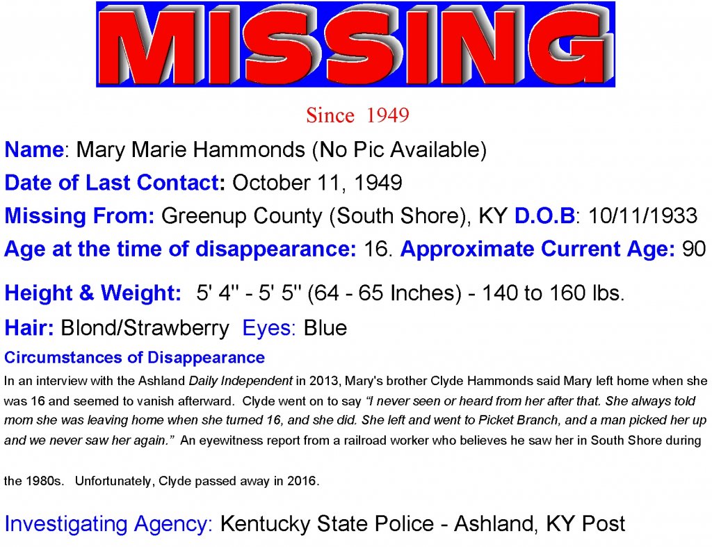 As of today, Kentucky has approximately 310 missing persons cases, some of which are literally decades old such as Mary's case.