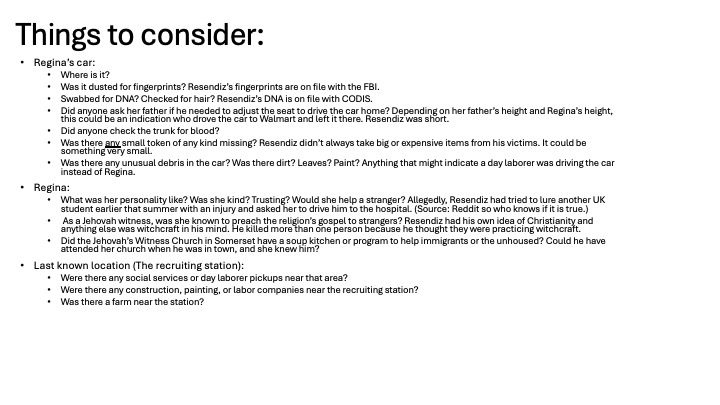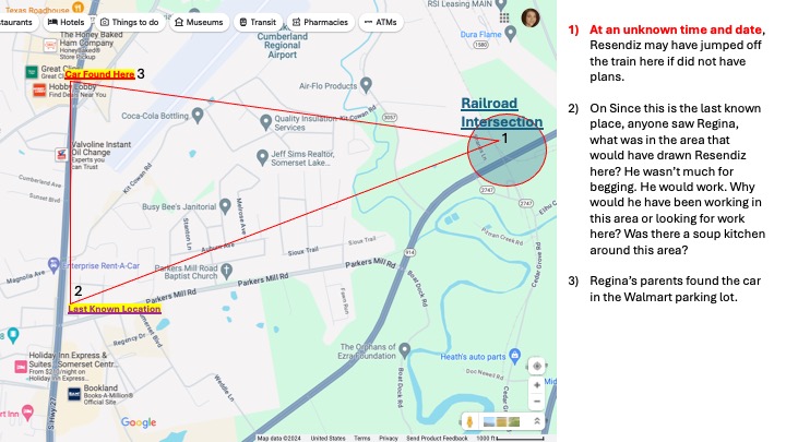 I noticed several people have mentioned things that I have observed since reviewing Regina's case. I had never known that she was potentially considered a victim of Angel Maturina Resendiz "The Railway Killer". When you look at this theory, it is actually very compelling. I have started a spreadsheet dating all the way back to 1986 (when Resendiz admitted to starting to kill) and began looking at all Jane and John Does in the United States that disappeared near railways. I think he may have been killing very early on. Anyway, here is something I mocked up based of Resendiz being a potential cause for her death. Note: there is no evidence she is dead, but I am assuming here.