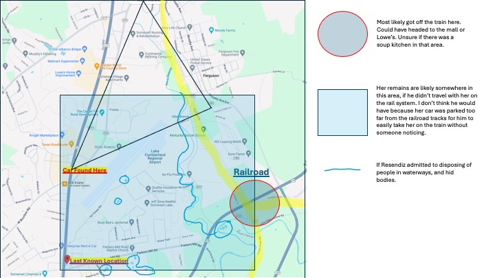 The train goes straight up from Somerset to Lexington. I think Resendiz had ties in Pulaski County, most likely from the fact he did farm work including picking tobacco. If he had worked for someone in Pulaski County on a farm, the body could be anywhere in the county. Resendiz admitted in an interview in 2003 that he did "chop them up in little pieces and throw them in swamp." When he was asking about potential victims not yet identified.