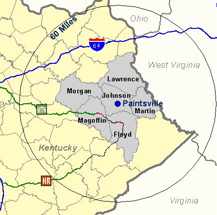Thanks for the info re: the gas tank. 60 miles is quite a distance. I actually found a map online of what a 60-mile radius from Paintsville looks like. Parts of it spill into neighboring states like Ohio, West Virginia, and Virginia.