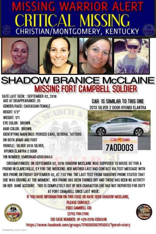 Original story: There seems to be a lot of drama behind the disappearance of Shadow McClain. At first it looks like a regular missing person case. Possible even she might have driven off the road and had a car accident. But, further research shows much more, and sadly it shows how, in one case, someone can easily label someone, and tarnish their reputation. At this point all I know is she is missing. Because Shadow is in the service she is under the jurisdiction of the government and they take precedence over law enforcement. More than likely the military is treating this case as a leave without absence, instead of a missing person case as law enforcement would do. Also, because it is military, they are under no obligation to speak about Shadow to media or anyone else. So, any information that comes out will probably be through the family.