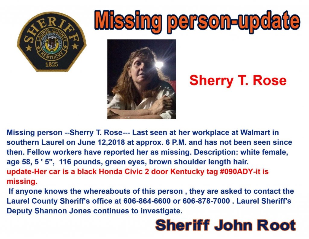 58-year-old Sherry T. Rose was last seen at her workplace at Walmart in southern Laurel County on June 12 at 6 p.m.