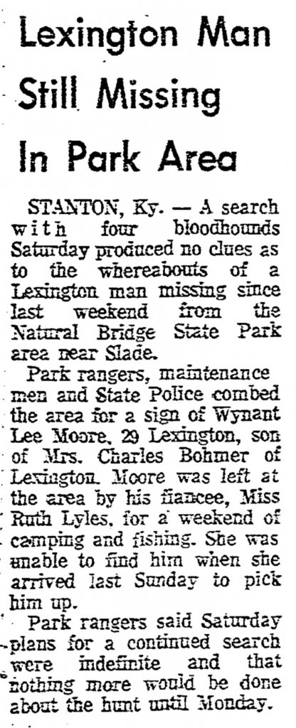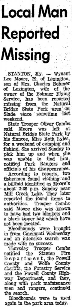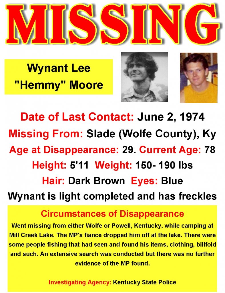 Circumstances of DisappearanceWent missing from either Wolfe or Powell, Kentucky, while camping at Mill Creek Lake. The MP's fiance dropped him off at the lake. There were some people fishing that had seen and found his items, clothing, billfold and such. An extensive search was conducted but there was no further evidence of the MP found.