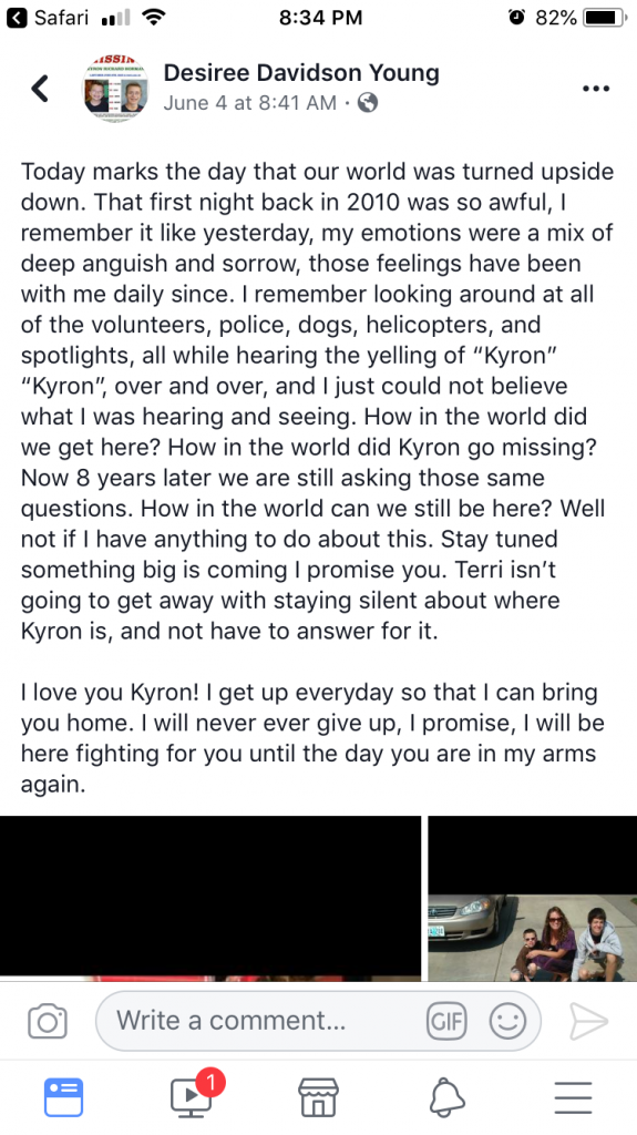 I tried not to give much thought to Desiree's "something is coming" posts since it was so close to the anniversary of when Kyron went missing. I believe identification of bones found will take some time. The bones of Lindsey Baum (10 yr old WA girl missing since 2009) were finally identified as belonging to Lindsey on May 10, 2018 after bones were found by hunters last Sept 2017.