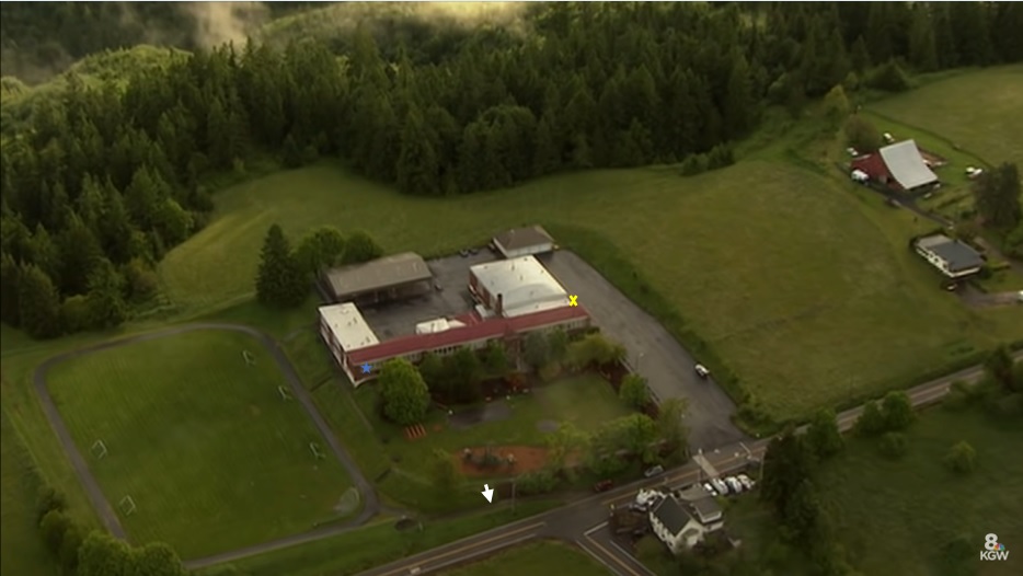 Below is a picture of Skyline School and its grounds. The blue star is Kyron's homeroom; the yellow "x" is the stairwell by the gym where she said she was standing at the top (a lie, btw), as she has a "vision" of the back of Kyron's head near his classroom door (another lie). This was all supposedly at 8:45 am. (All IMO)