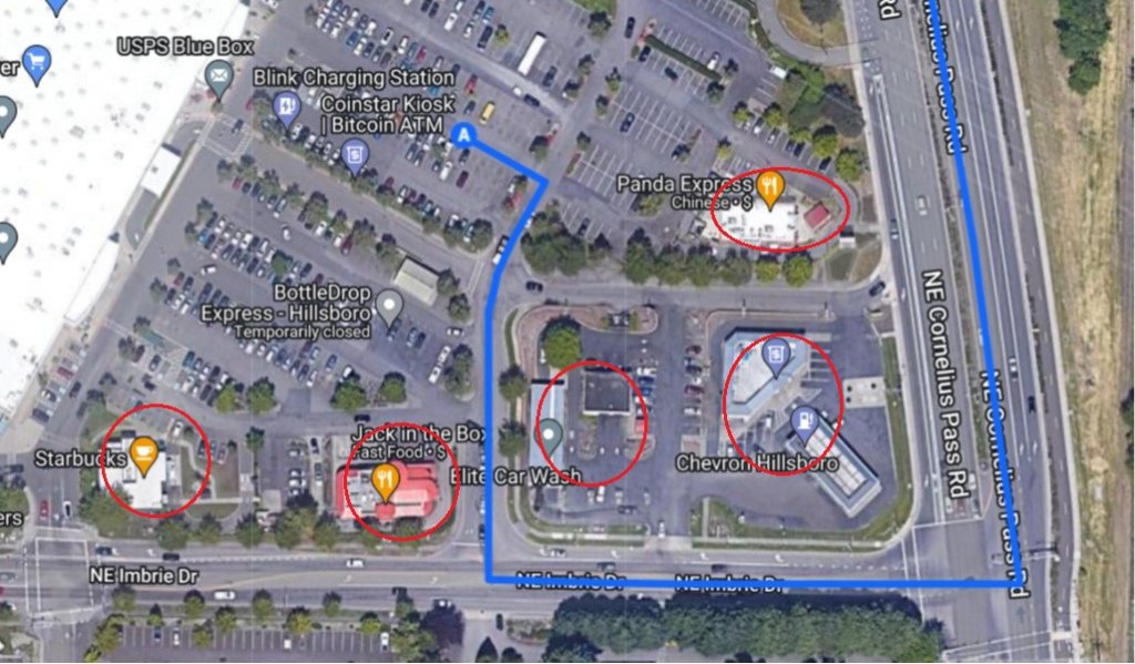 "A" is the approximate vicinity of her chosen parking spot at Imbrie/Cornelius Pass Fred Meyer. I've circled the prominent parking lot businesses. (This may have changed since 2010 but I'm sure most of them would have been there, or something else in their place).