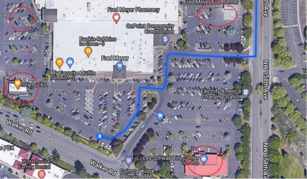 "B" is the approximate vicinity of her chosen parking spot at Walker Road Fred Meyer. The red circles indicate the same pattern of parking where there was no chance of surveillance cameras monitoring the F250 while she was "shopping" inside the Fred Meyer with the baby.