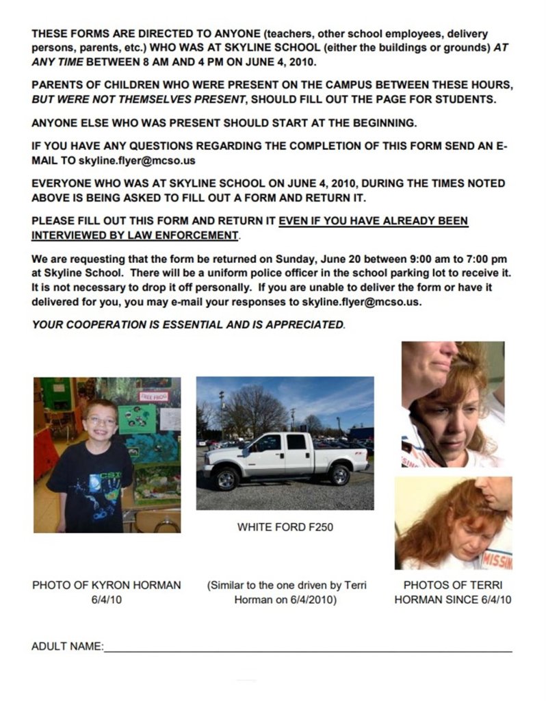 Snipped quote: [Jun 18, 2010] There was one new piece of information: “Terri is the last-known person to have seen him before he disappeared,” Multnomah County Sheriff’s Capt. Jason Gates said, contrary to previous reports of someone else who might have seen the boy afterward. …This week, investigators sent a questionnaire to Skyline parents and students asking about their memories of Kyron’s whereabouts on the day he vanished, including any sighting of his stepmom’s pickup truck. That question reads: "Did your child see a white Ford F250 truck at or near the school on 6/4/10?"