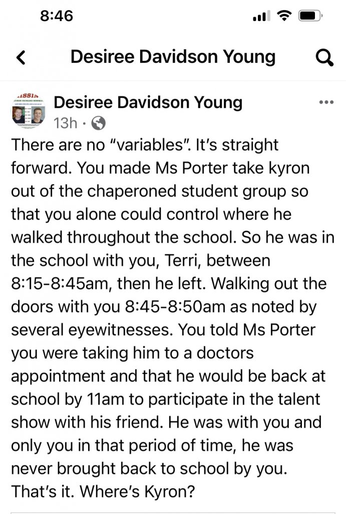 I think it's clear at this point that Desiree is working off some original scenario that she has developed since 2015 without input from LE. Nothing of this matches the info we have, or makes sense both with what we do know or even within itself. Why would Porter tell the chaperone that Kyron was probably in the bathroom or mark Kyron as absent at 10:00 if she knew he was with Terri and expected him back at 11:00? Why would Terri remove Kyron from the group for a personal tour between 8:15 and 8:45 when the groups didn't form until 8:45? Why did Gina Zimmerman say she saw Kyron and Terri by the project in the classroom at 8:15 if the events (picture-taking and tour) were reversed, as Desiree claims? Why, if Terri told everyone exactly what happened to Kyron - that he left with her - did the police feel any need to search the school and the surroundings? Why would they not have arrested her immediately when all those testimonies came to light?