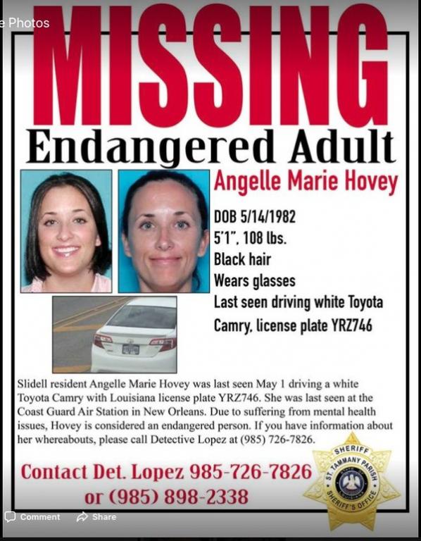 Slidell area resident Angelle Marie Hovey, 35, was last seen driving a white Toyota Camry at the Coast Guard Air Station in New Orleans. The Camry has Louisiana license plate YRZ746, the Sheriff's Office said Tuesday (May 8).