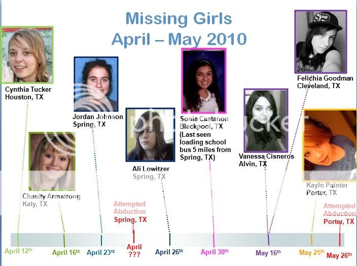 Check it out!http://i628.photobucket.com/albums/uu6/traciemills1/TimeLine.jpg These girls very well could be connected if you look at a Google map, they are pretty equal distances from Houston going out. Katy in one direction, Spring in another, Porter and so on. We know BSL is familiar with those areas. These girls all went missing April-May 2010.What do you all think?