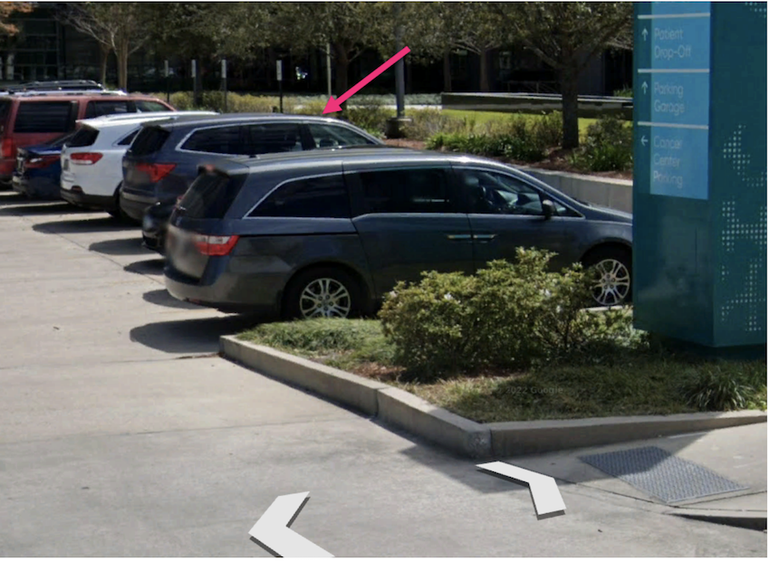 If the link displays properly, you should see the same vehicle, a gray/blue Highlander, as shown in Karen's posting, located in the University Medical Center Oncology parking lot. The "image capture" caption at the bottom right of the screen says "Mar 2022".