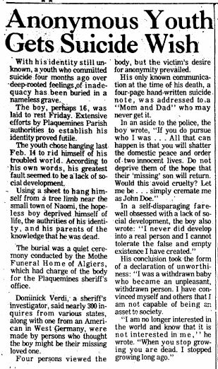 Hey everyone. Long time follower of this young man. My thoughts on this one have always been that he ran far away from home to do this. Far away from family. Most likely reason why his parents have never come forward. People forget there was no internet or social media back then so, information and news didn't reach everyone as fast or at all, in some cases. All it would take would be for a family member or friend to come forward inquiring about Mr. so and so and we may one day get answers. But unless that happens, I dont know if it will ever be solved. But my gut has always told me his parents did search for him as much as they could but couldnt find him. It is obvious from the note that they loved him. I think of him often.