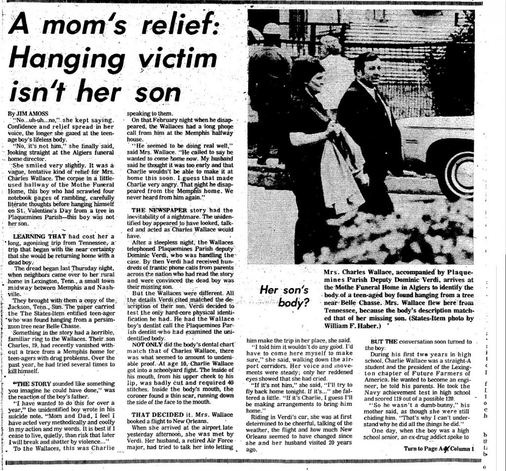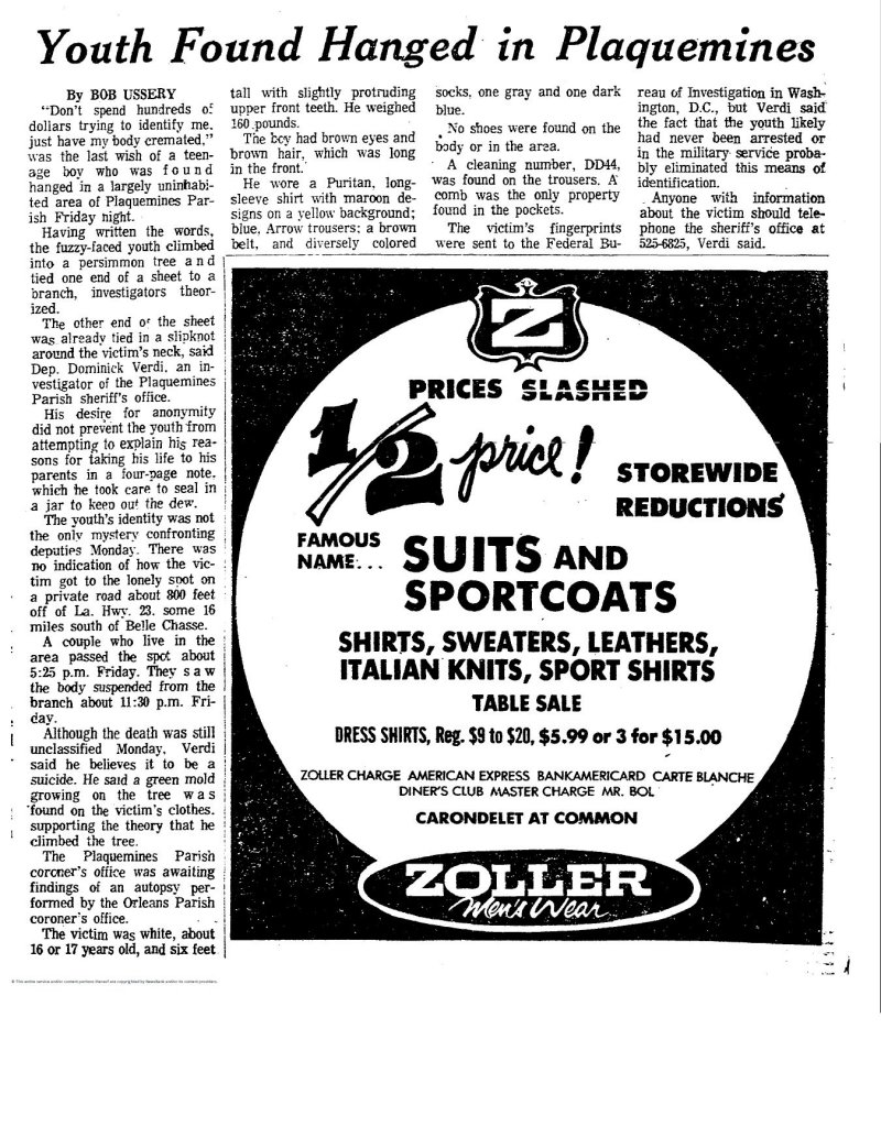 I have put in a call to the Orleans Parish Coroner and had to leave a voice mail. One of the articles mentions the detective Dominick Verdi, who is deceased. He discusses sending the young man’s body to the Orleans Parish Coroner for an autopsy. FACES only has the death certificate. That’s all the library could give me.