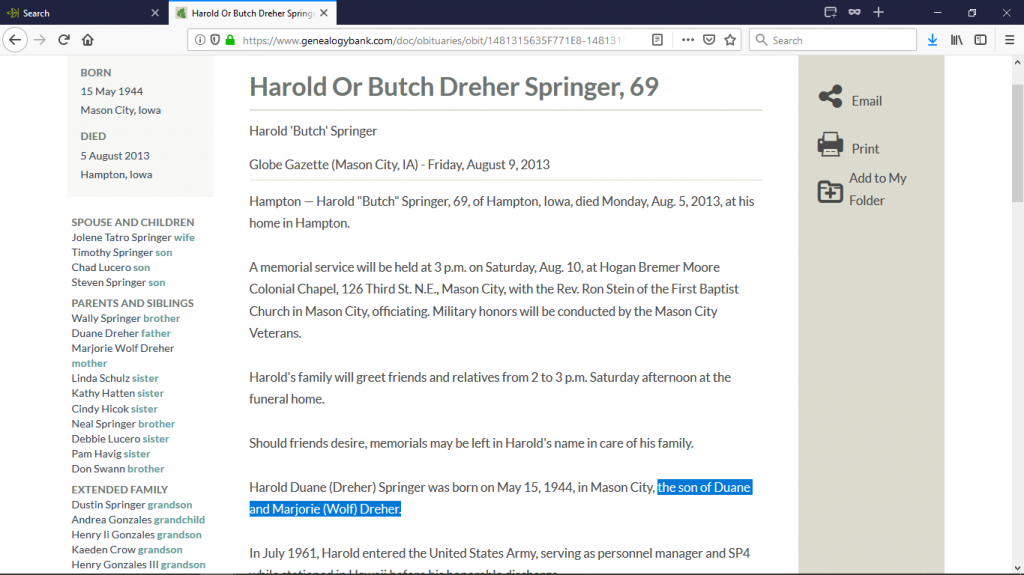 Wanted to say I searched FamilySearch and located a Duane Dreher that passed 8/9/13 in Mason City, Iowa. Married to Marjorie. Wonder if same?