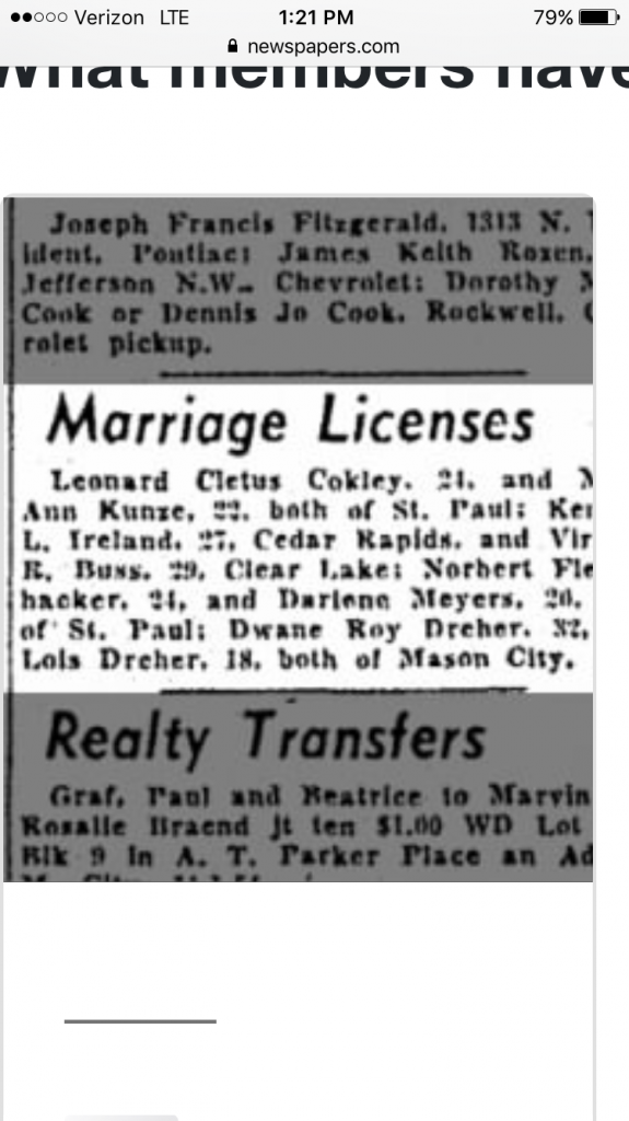 Almost exactly one year prior to his disappearance, The Globe Gazette reported Dreher’s request for a marriage license in Mason City on Monday, Nov. 15, 1954.