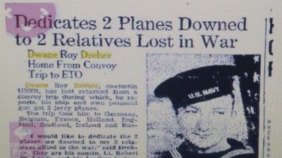 In this June 18, 1945, article published by the Mason City Globe Gazette, Dwane Dreher dedicates two recent downed planes to two relatives he lost in the war.