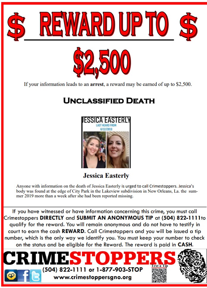 NOPD has asked anyone with information on Jessica Easterly's death to contact 3rd District Detective's at 504-658-6030 or provide information anonymously through CRIMESTOPPERS at 504-822-1111