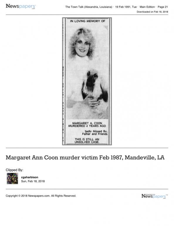 After all these years, I finally found an online photo of Margaret Ann Coon. This picture was included in a classified ad placed by her father four years after her murder in his local paper (Alexandria, LA). The classified ad and photo of Margaret is a memorial to his daughter and a reminder that her murder was still unsolved back in 1991. Tomorrow (Feb 19, 2018) will mark 31 years with no arrest and no answers.