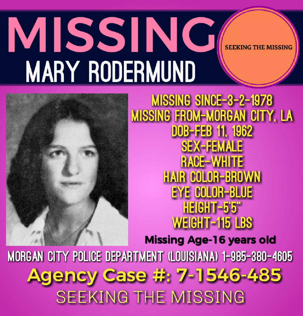 Missing From: Morgan City, LA. Missing Date: March 2, 1978. Both photos shown are of Mary. She was last seen on March 2, 1978..
